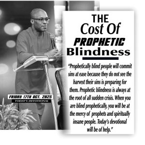 Prophetically blind people will commit sins at ease because they do not see what harvest their sins are preparing for them. That means when people are blind prophetically, they will lose the sense of God’s judgment on sin and come to a realm where they are made to believe that they do not need repentance.